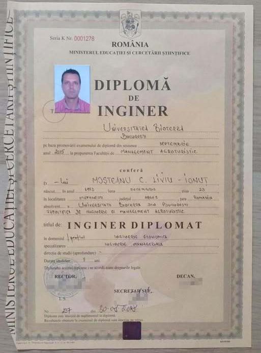 Ministrul Apărării, Ionuţ Moşteanu, şi-a publicat joi, pe Facebook, diploma de licenţă la Universitatea Bioterra, Facultatea de Inginerie şi Management Agroturistic, după ce într-un CV vechi, postat pe site-ul companiei Tarom, scrisese că a absolvit Universitatea Athenaeum din Bucureşti. Ministrul arată că este ”o greşeală care recunoaşte că îl jenează”.”Nu am dat prea multă atenţie atunci acestor detalii. Pentru asta îmi cer scuze”, mai spune ministrul.