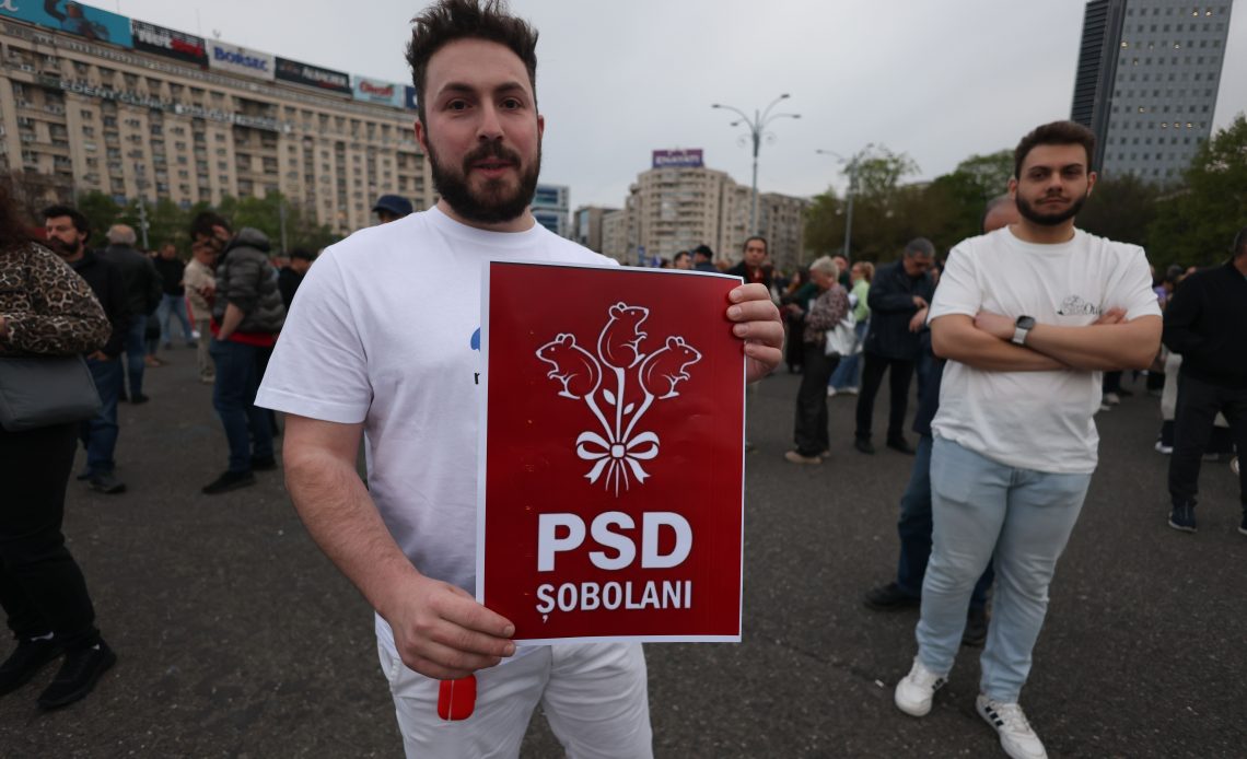 Manifestanții se află în alveola din fața Guvernului și protestează pașnic față de decizia social-democraților de a nu-l mai susține pe Bolojan în fruntea Guvernului. Unii dintre participanți flutură steagul României și pe cel al UE.